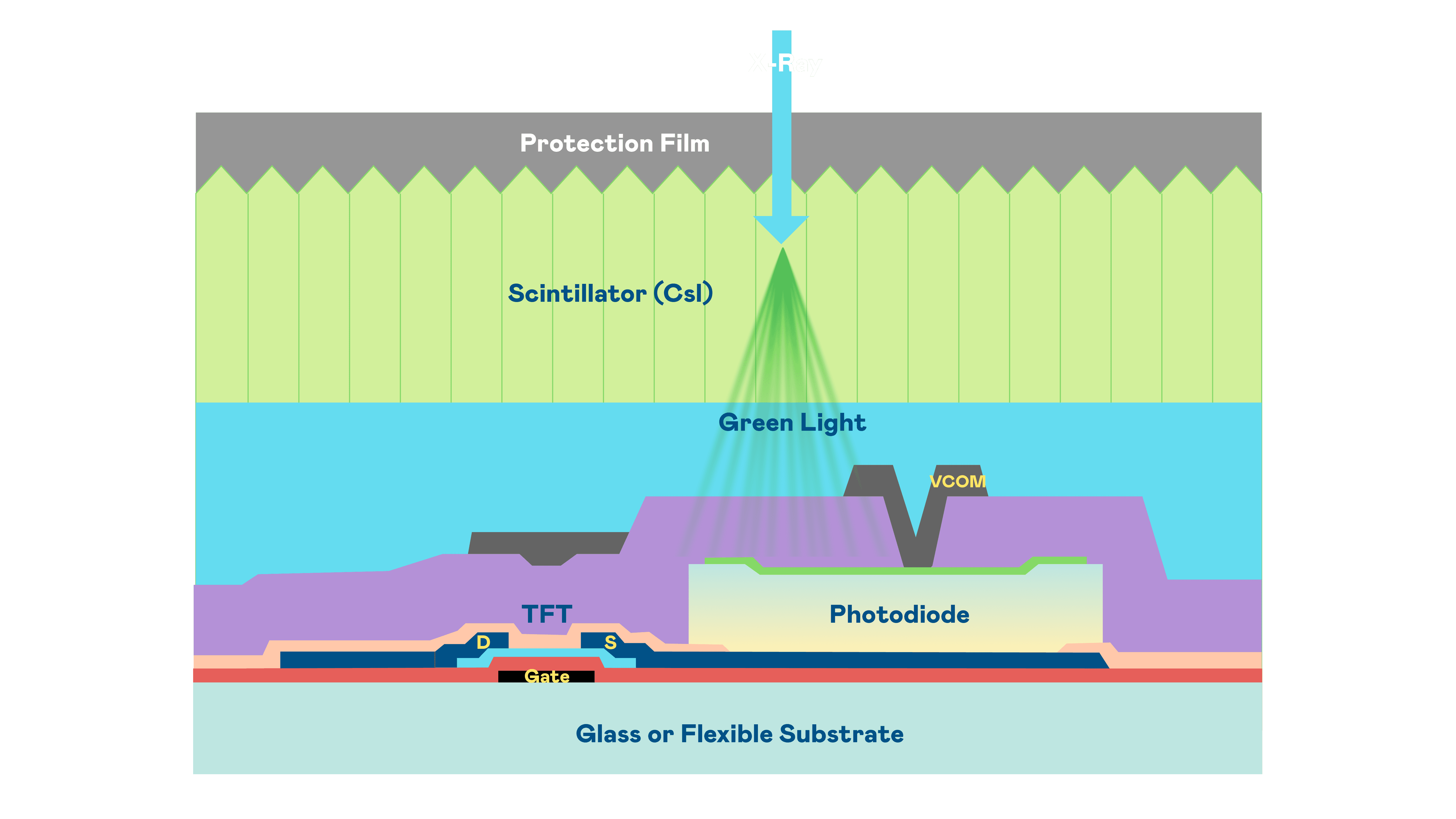 OBPay的X光影像感测阵列使用薄膜电晶体 (TFT) 作为每个像素的读取开关,,搭配光电二极体(Photodiode)的光电转换元件,,,用以感测X光影像讯号。。。